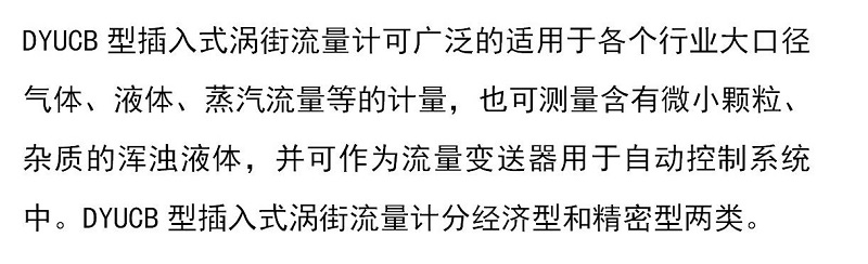 DYUCB型插入式渦街流量計可廣泛的適用于各個行業(yè)大口徑氣體、液體、蒸汽流量等的計量,也可測量含有微小顆粒、雜質(zhì)的渾濁液體,分經(jīng)濟型和精密型兩類。